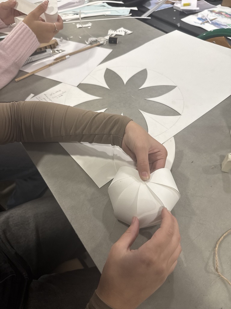 Une fois les croquis finalisés, place à la réalisation des patrons destinés à la construction de la maquette. Les participants ont découvert comment passer d’un dessin à une forme tridimensionnelle, étape incontournable du processus de conception. Accompagnés pas à pas, ils ont appris à manipuler les outils de base du designer : cutter, réglet, colle, gabarits… L’objectif était de comprendre la logique du volume, la précision du tracé et la rigueur nécessaire à l’assemblage d’une maquette. Cette phase a aussi permis de se familiariser avec les méthodes de travail enseignées dans le Bachelor Design et Architecture d’Intérieur, formation où créativité et technique avancent toujours de pair.