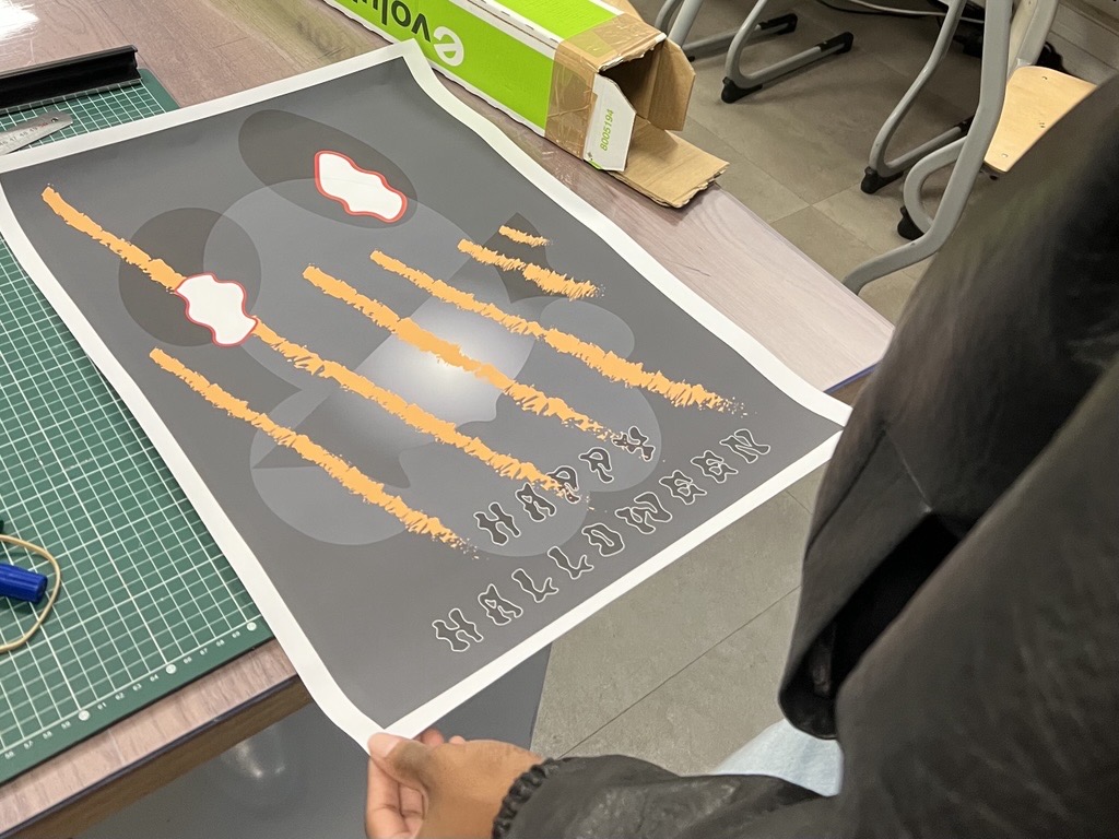 Le projet a débuté par la réalisation de kakémonos de peinture abstraite. Sur ces grandes bandes verticales, chacun a exploré le geste, la matière et la couleur, sans contrainte figurative. Cette première phase, entièrement manuelle, a permis aux étudiants de renouer avec la spontanéité et la dimension expressive du travail pictural, loin des exigences techniques du design d’espace.