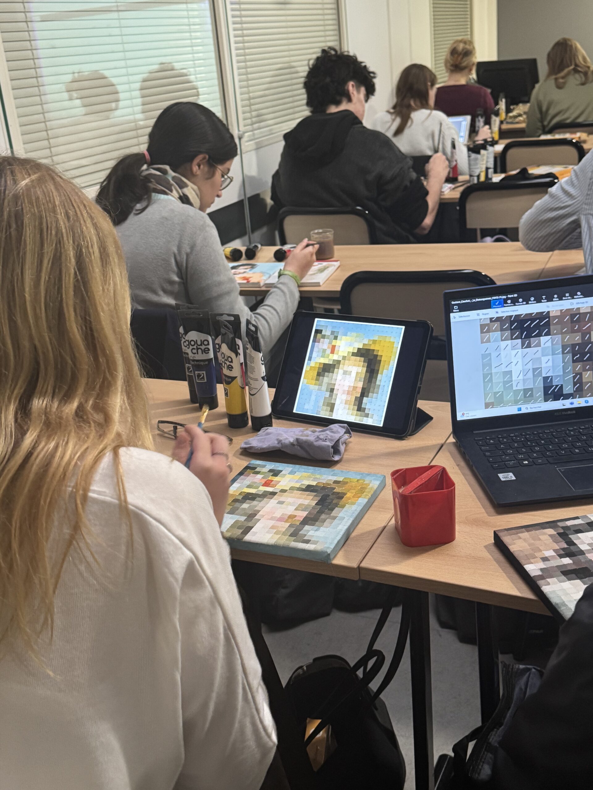 Les œuvres ont ensuite été scannées et retravaillées sur Photoshop, offrant une nouvelle étape de création. En modifiant les teintes, les contrastes ou les compositions, les étudiants ont pu transformer leurs peintures en véritables paysages numériques. Cette confrontation entre art plastique et outils digitaux a permis de réfléchir à la continuité entre matière et image, entre trace du geste et manipulation virtuelle.